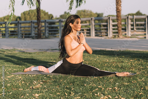 Latin Woman Does Yoga Exercises In A Park In Madrid Balance And Concentration Stock Image Image Of Lifestyle Laying 158183779